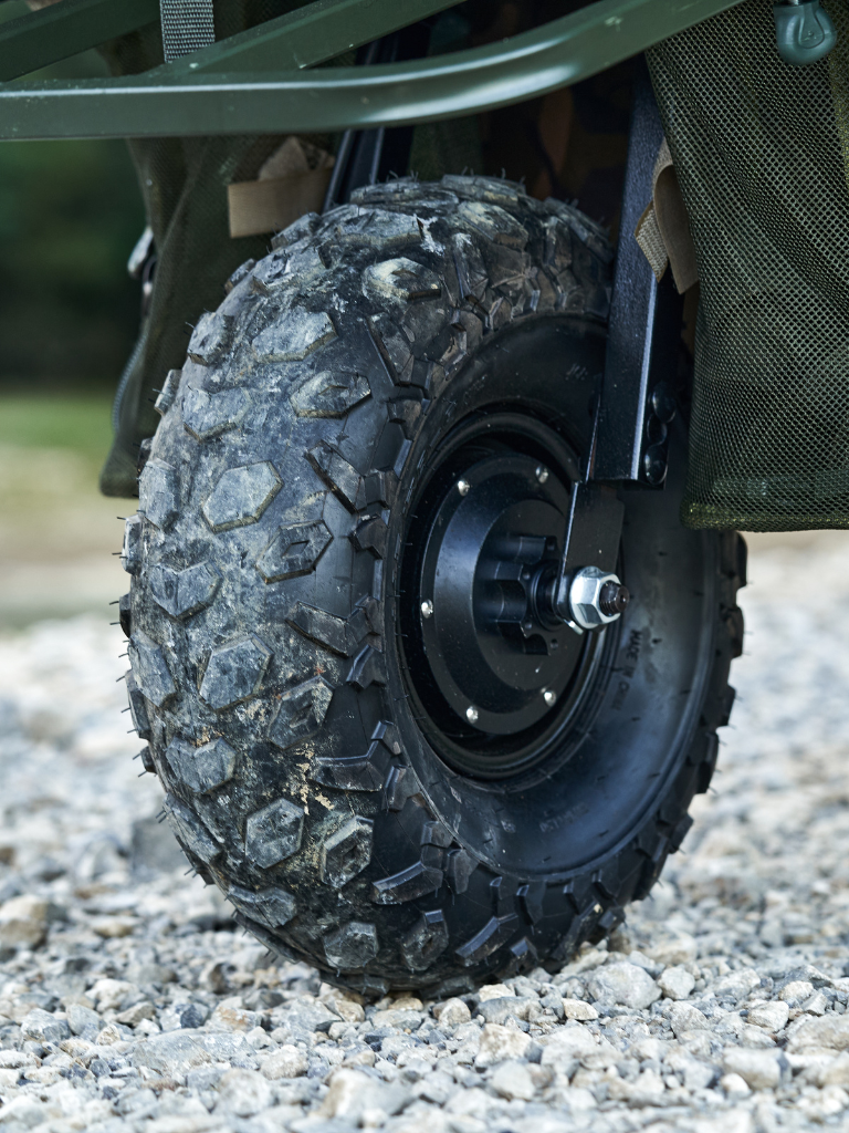 - Con una rueda muy robusta y un neumático de grandes tacos puedes superar cualquier terreno de barro.